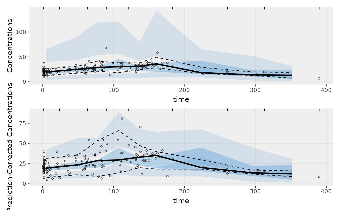 p2 <- vpcPlot(fit, pred_corr = TRUE, show=list(obs_dv=TRUE))