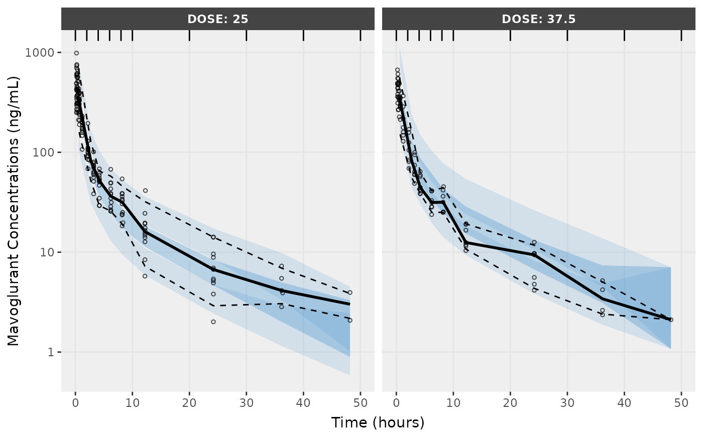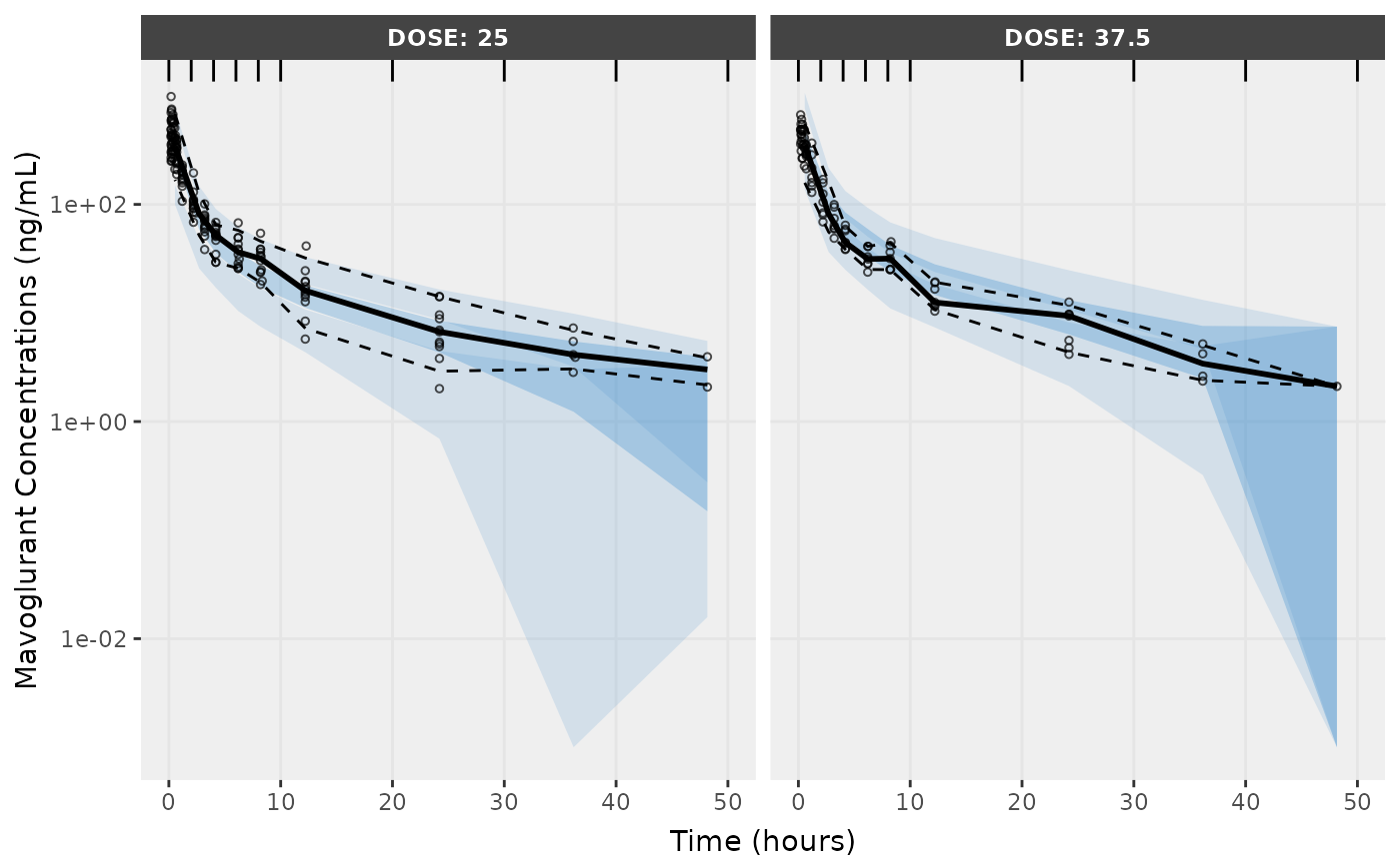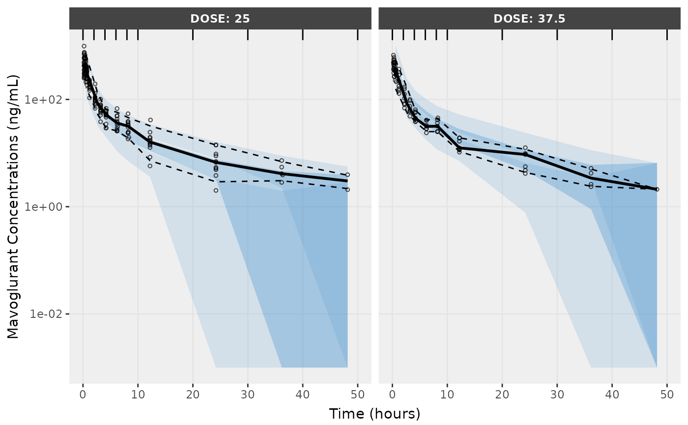 f2 <- vpcPlot(fit,n=500, show=list(obs_dv=T), bins = c(0, 2, 4, 6, 8, 10, 20, 30, 40, 50), log_y=TRUE,