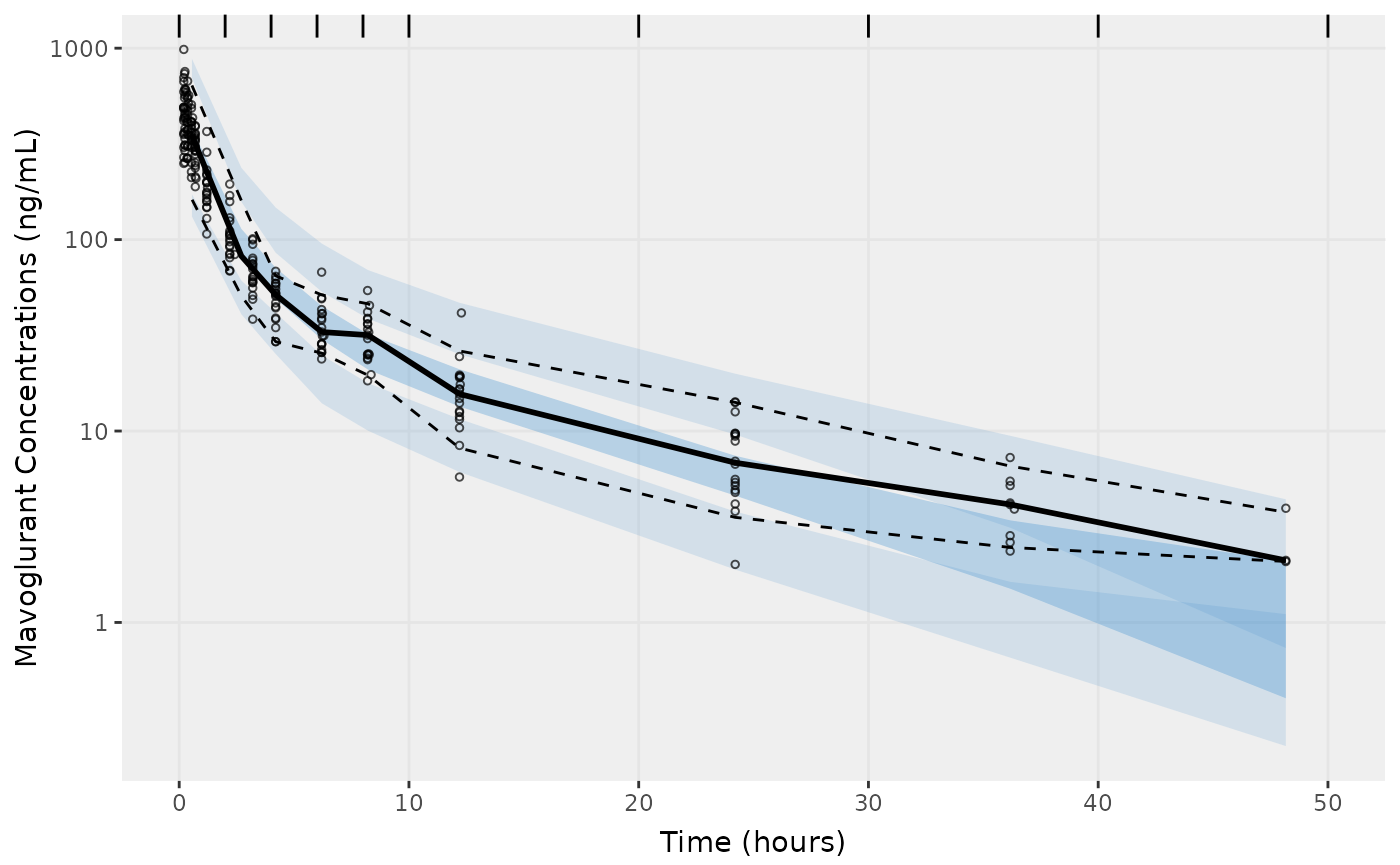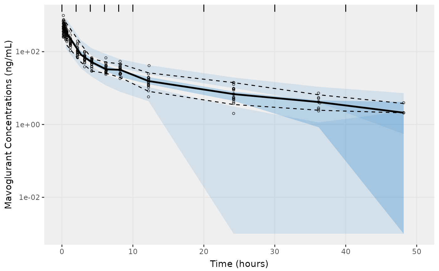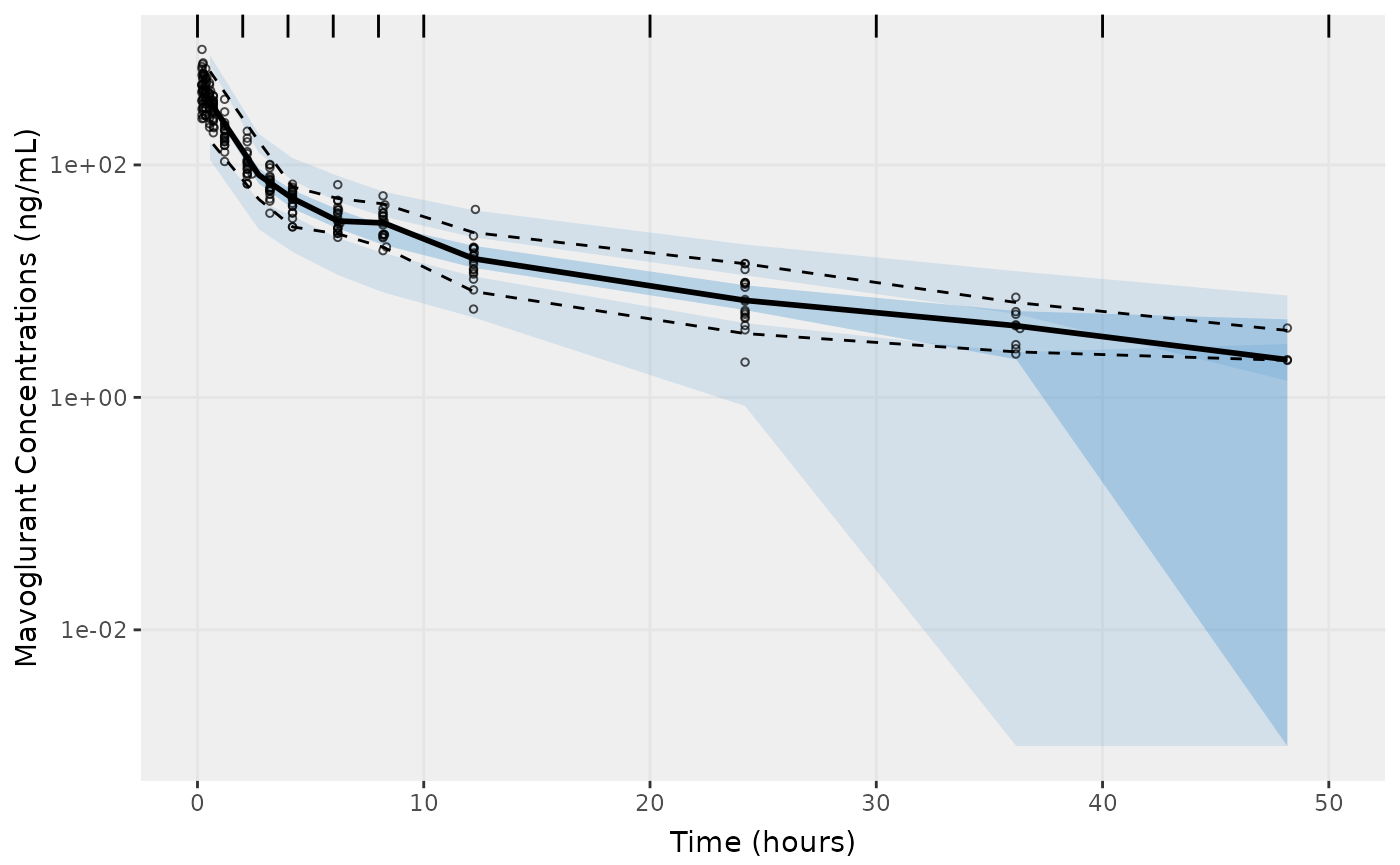 f2 <- vpcPlot(fit,n=500, show=list(obs_dv=T), bins = c(0, 2, 4, 6, 8, 10, 20, 30, 40, 50), log_y=TRUE,