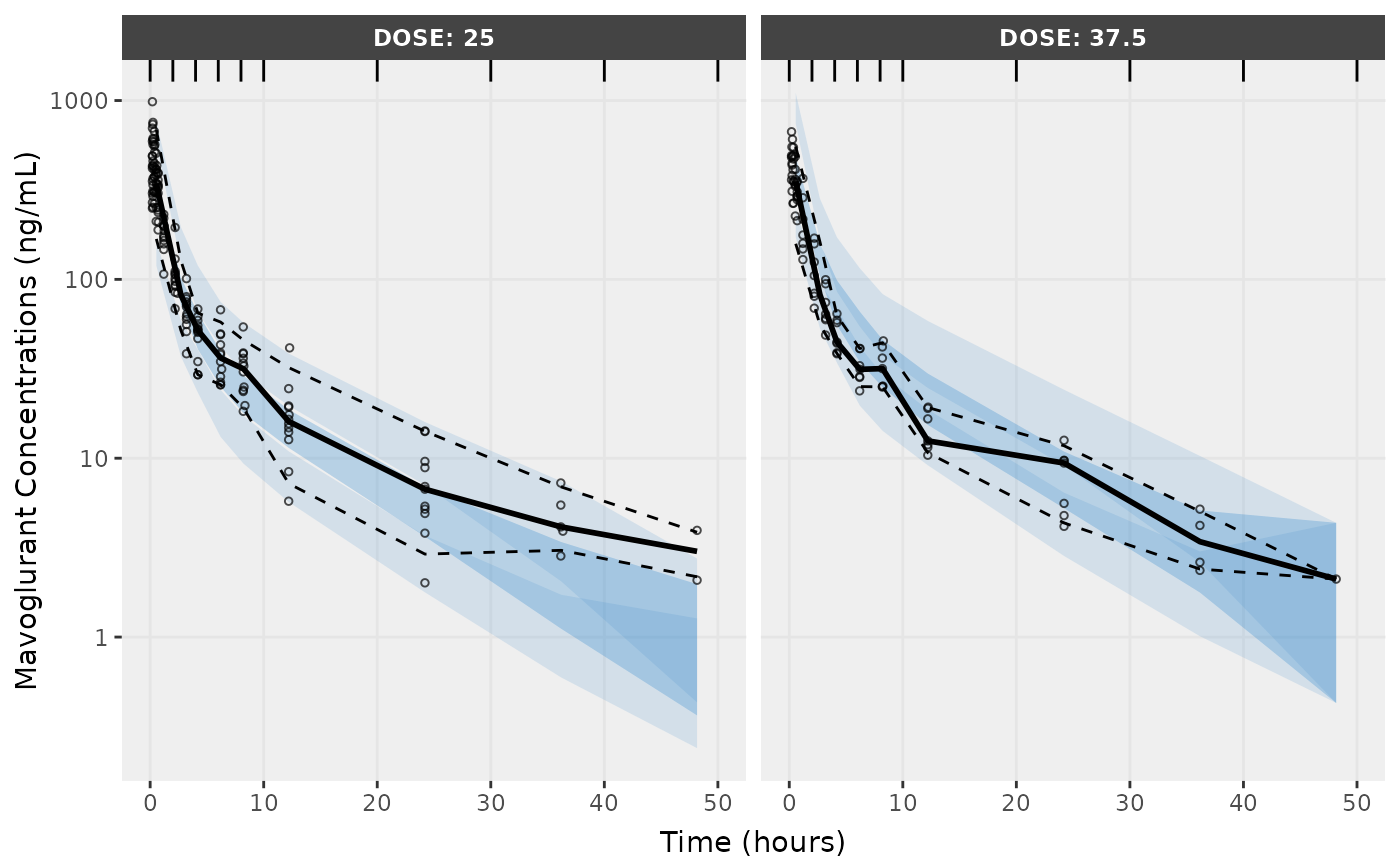 f1 <- vpcPlot(fit,n=500,stratify="DOSE", show=list(obs_dv=T), log_y=TRUE,