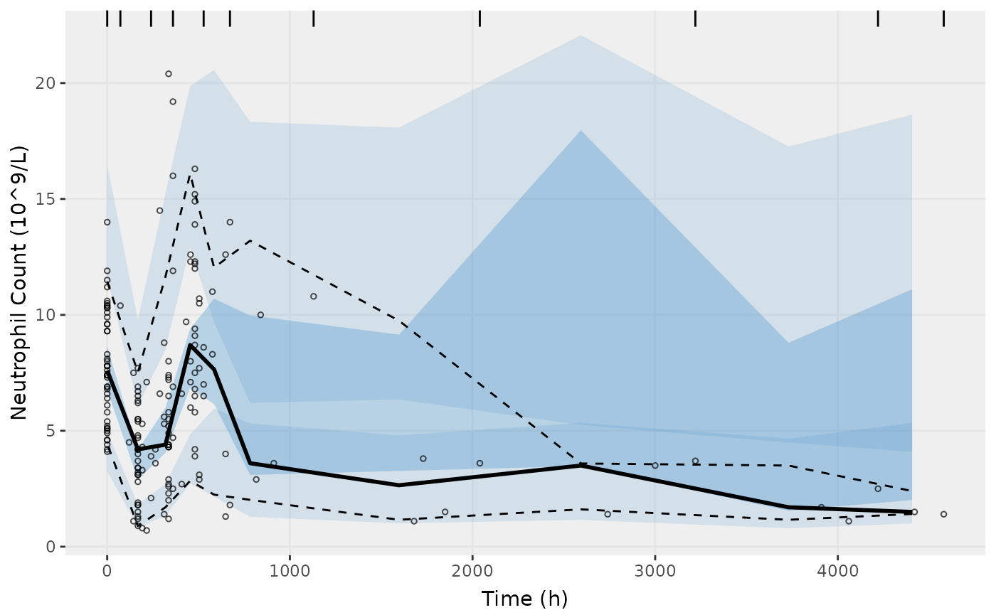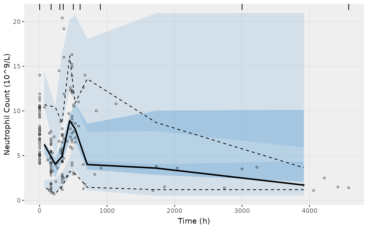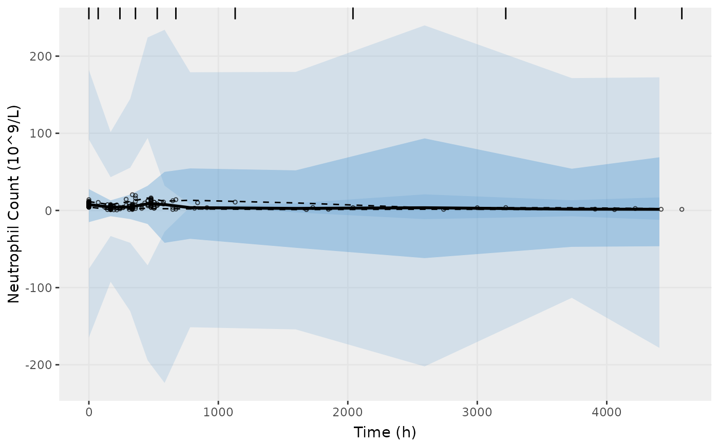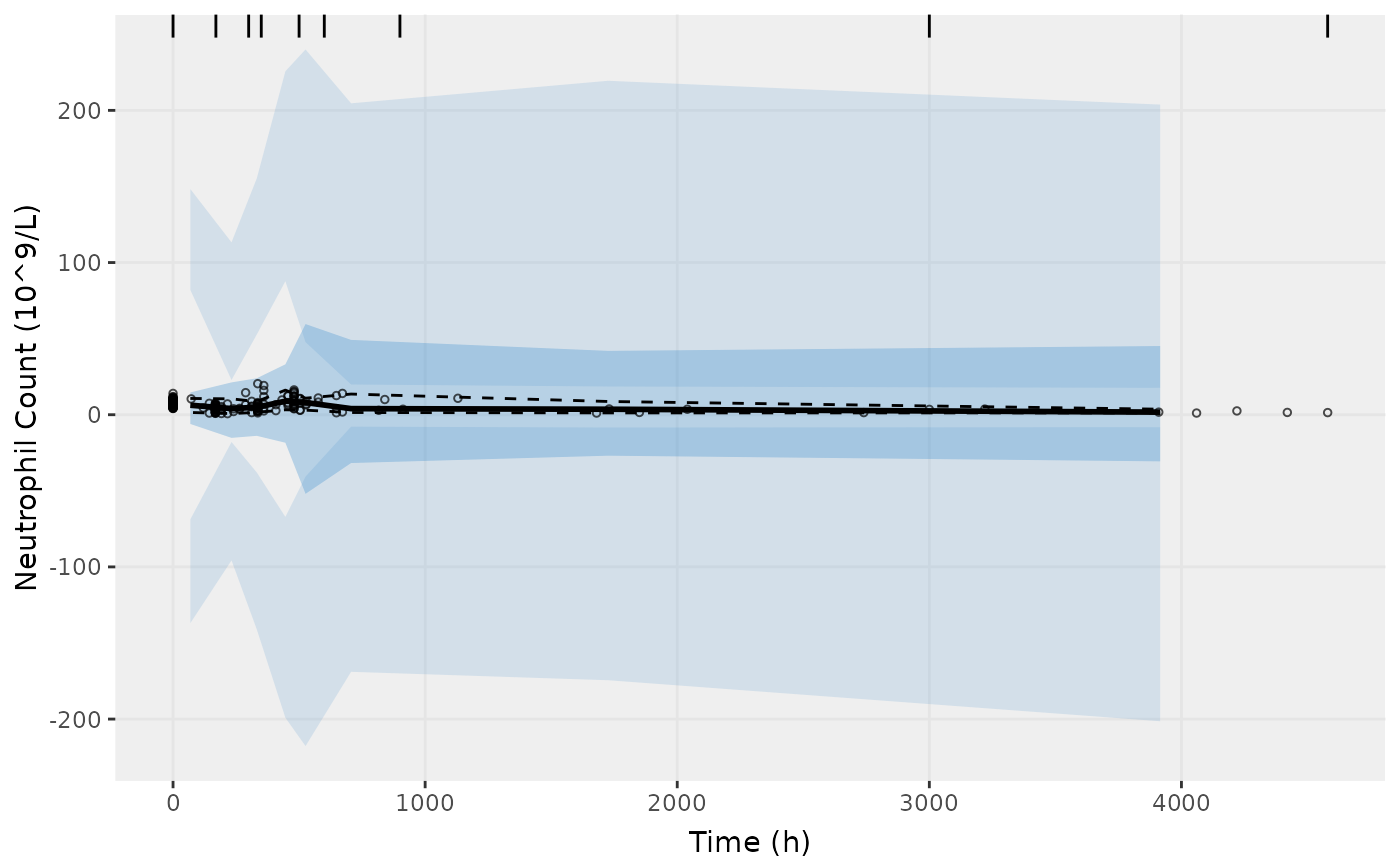 show=list(obs_dv=TRUE), ylab = "Neutrophil Count (10^9/L)", xlab = "Time (h)")