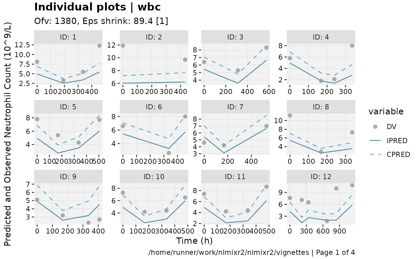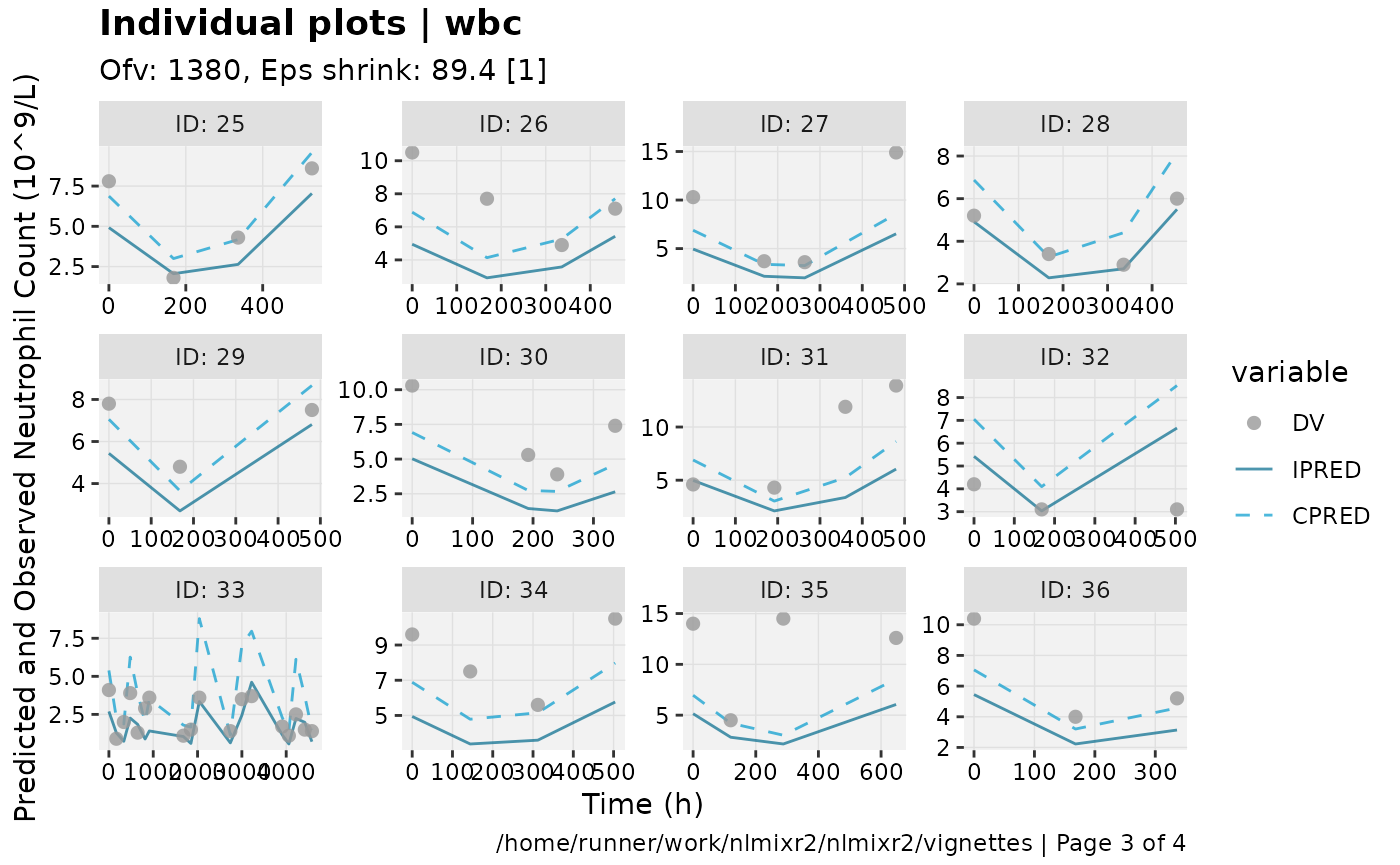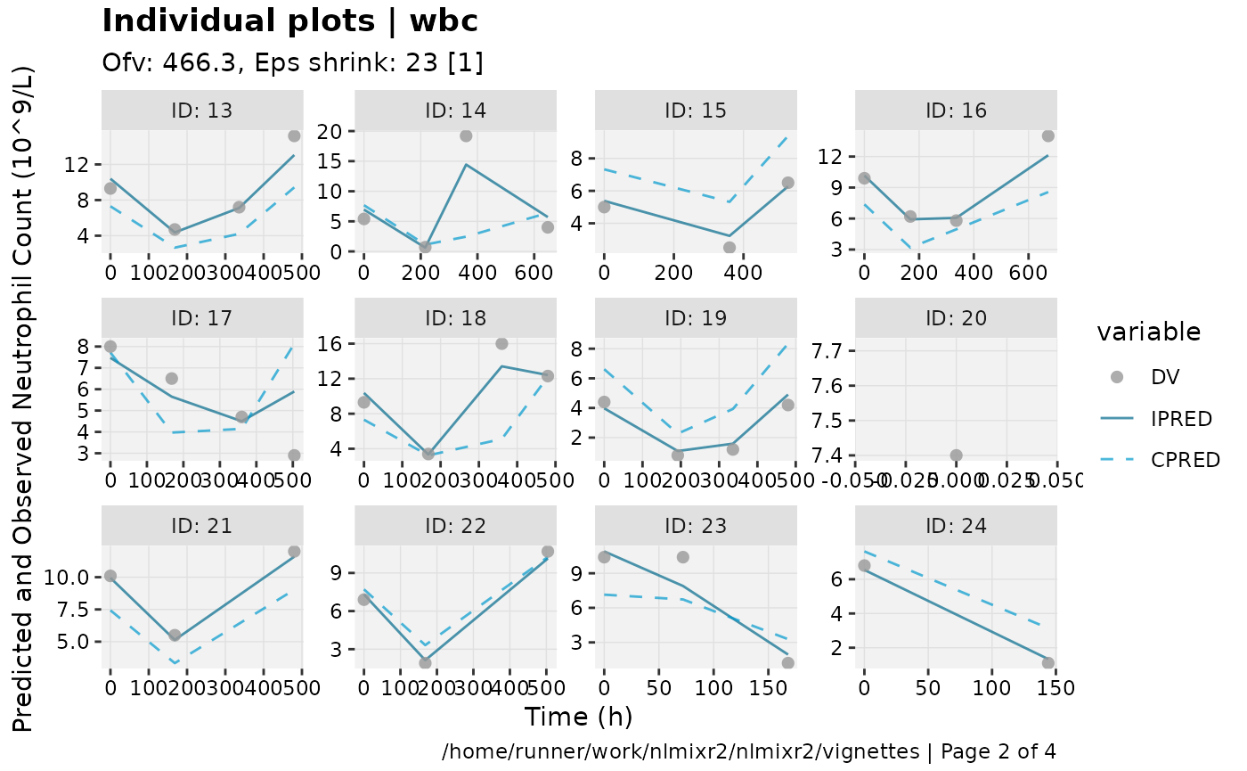 show=list(obs_dv=TRUE), ylab = "Neutrophil Count (10^9/L)", xlab = "Time (h)")
