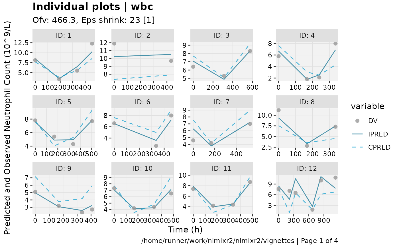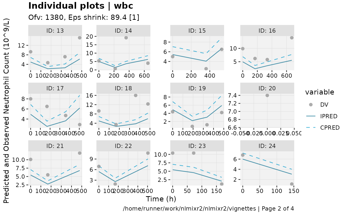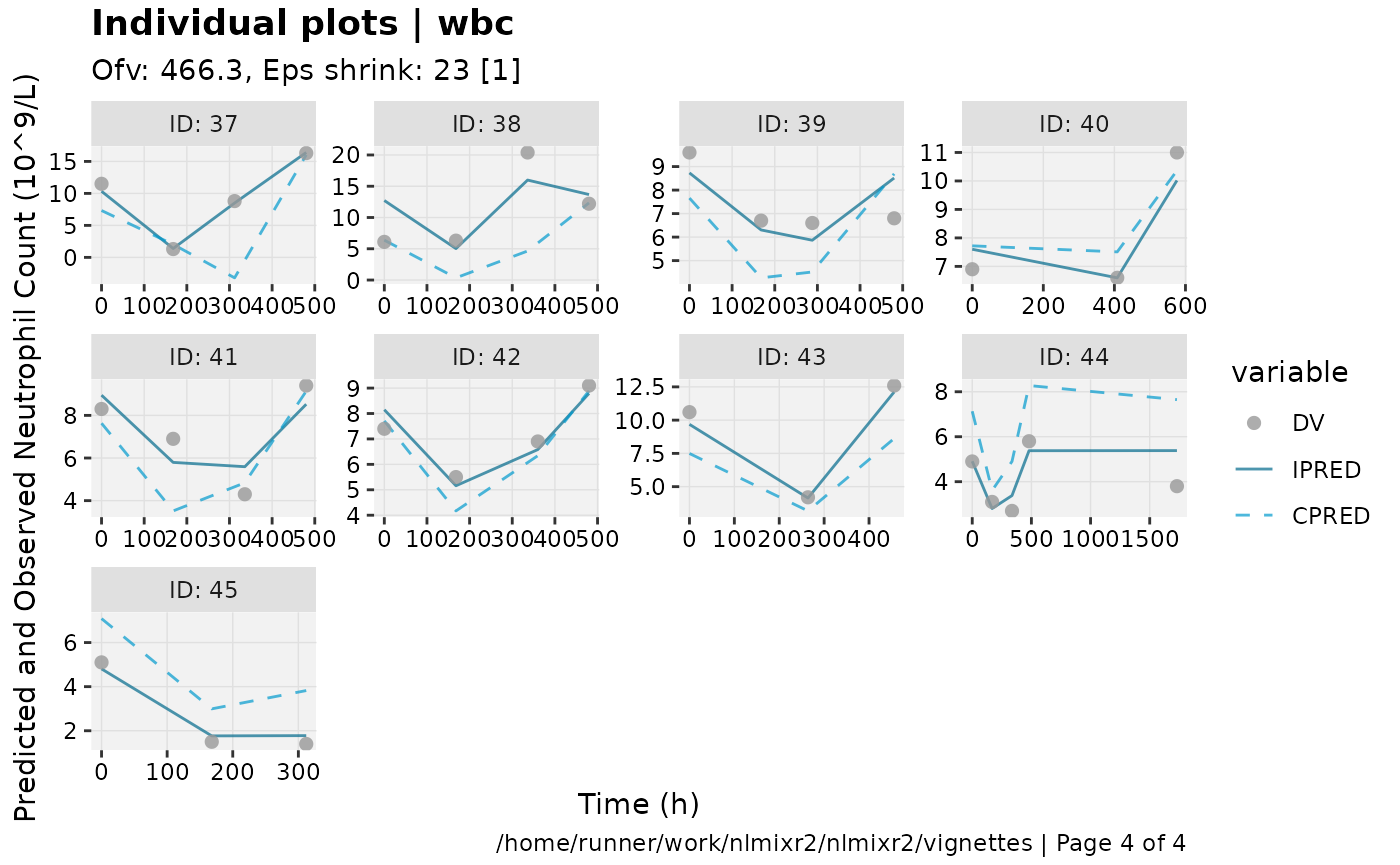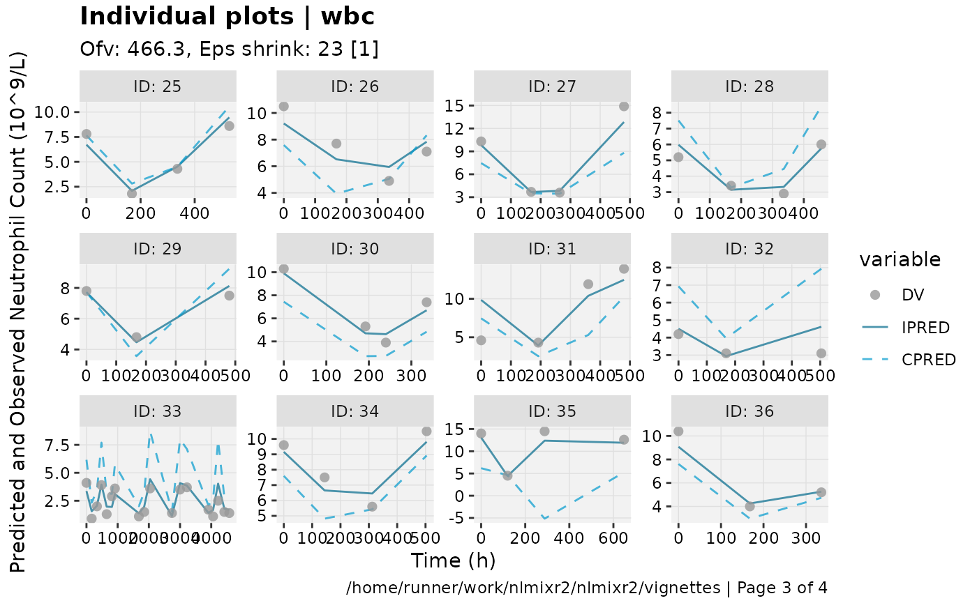 show=list(obs_dv=TRUE), ylab = "Neutrophil Count (10^9/L)", xlab = "Time (h)")